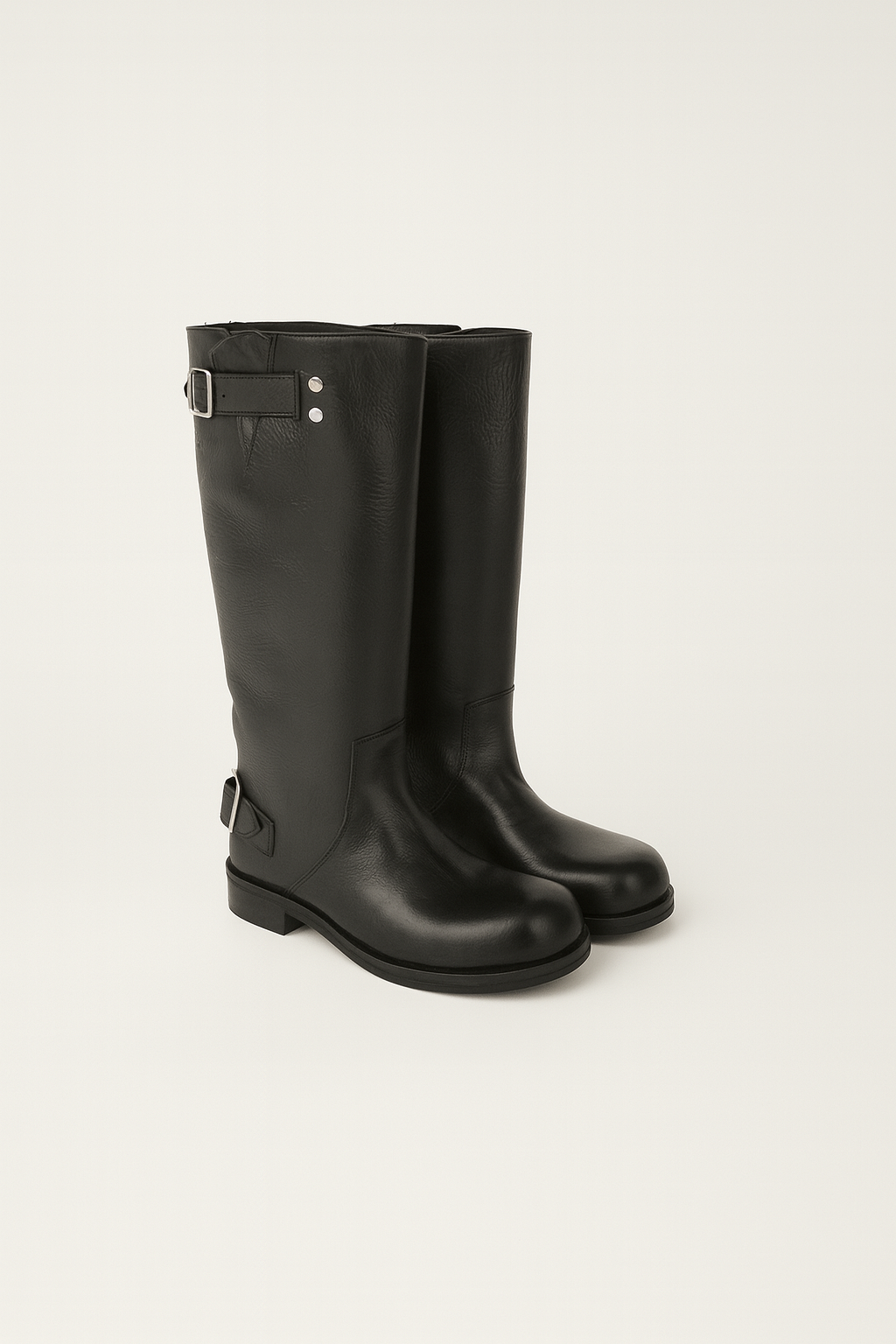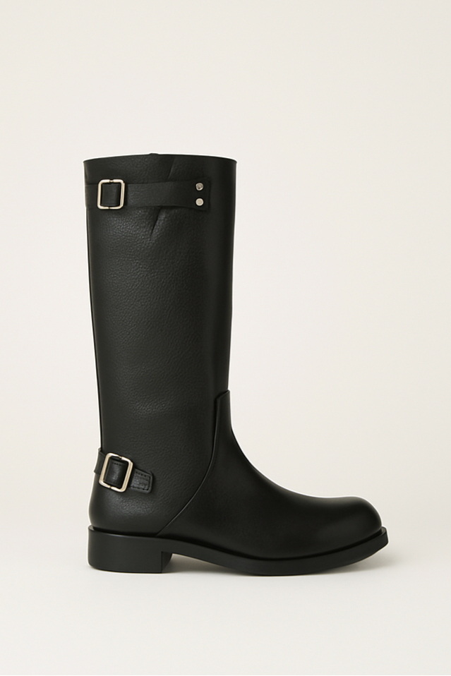 Bota de caña alta de cuero con detalle de pasadores y hebillas con fondo de goma