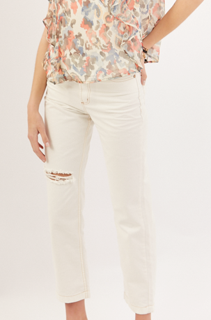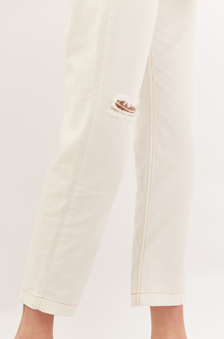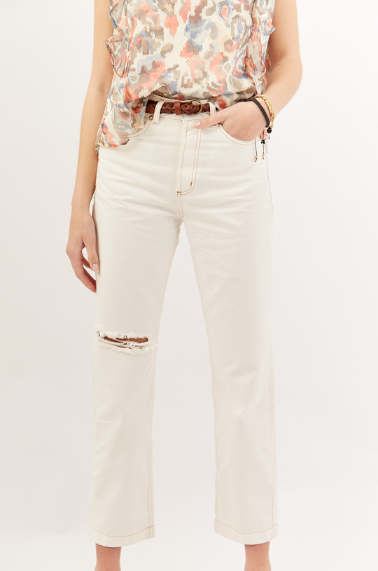 Jean recto corte mom. Con costuras a contratono color camel. Rotura en una de sus piernas a la altura de la rodilla.