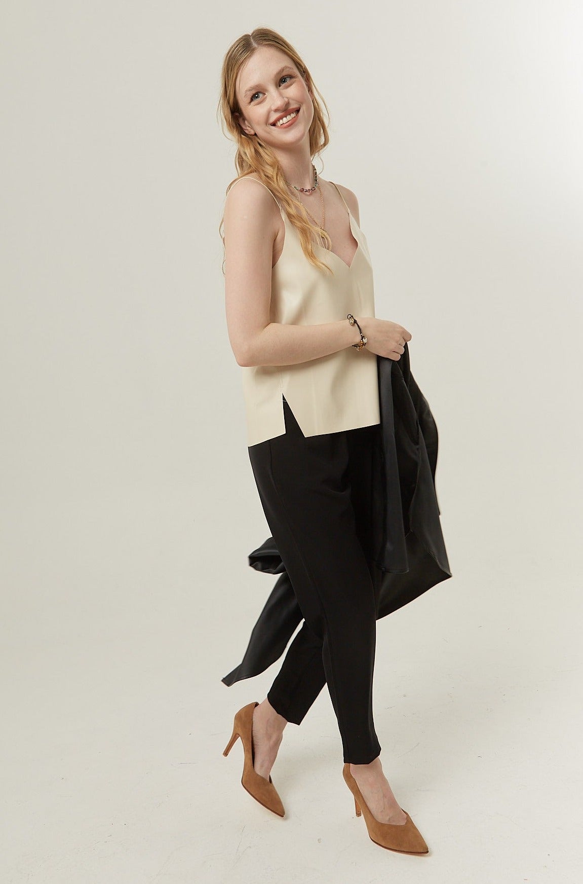 Zapato stiletto escotado en cuero gamuzado color Camel